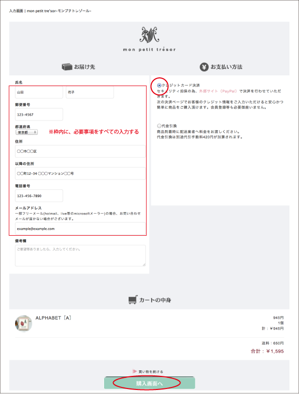 2:お届け先を入力します。すべて必須項目です。お支払い方法を「クレジットカード決済」にし、[購入画面へ] をクリックします。