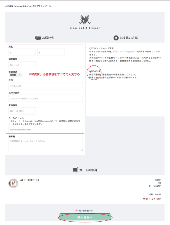 2:お届け先を入力します。すべて必須項目です。お支払い方法を「代金引換」にし、[購入画面へ] をクリックします。