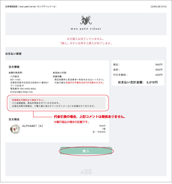 件 名:BASE様へのお支払い ←注)BASEでの決済になります。
